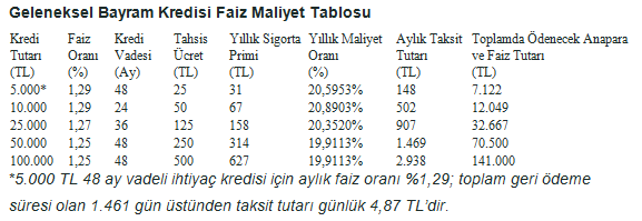 Kampanya kapsamında vade 3-48 ay arasında belirlenebilmektedir. Aylık taksit tutarları, geri ödemeler 30 gün sonra başlayacak şekilde hesaplanmıştır. Kefil ön şartı aranmamakla birlikte, şubelerimiz gerekli gördükleri takdirde kefil talep edebilecektir. Tahsis ücreti ve sigorta primi tabloda belirtilen kredi dilimleri için örnek olarak hesaplanmıştır. Tahsis ücreti kredi tutarına göre değişkenlik gösterecektir. Söz konusu ücrete %5 oranındaki BSMV dahil değildir. Sigorta primi ise 35 yaş üzerinden hesaplanmış olup; kredi tutarı, kredi vadesi ve müşterinin yaşına göre değişkenlik gösterecektir. Hesaplanan yıllık maliyet oranına sigorta tutarı dahil edilmemiştir. Banka, kampanya süresince kampanya koşullarını değiştirme hakkını saklı tutar.