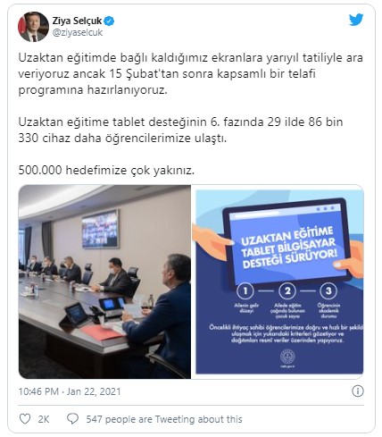 Yarıyıl tatili sonrasındaki planlamaları ile tablet bilgisayar dağıtımlarının geldiği noktaya ilişkin Twitter hesabından paylaşımda bulunan Milli Eğitim Bakanı Ziya Selçuk, şunları kaydetti: