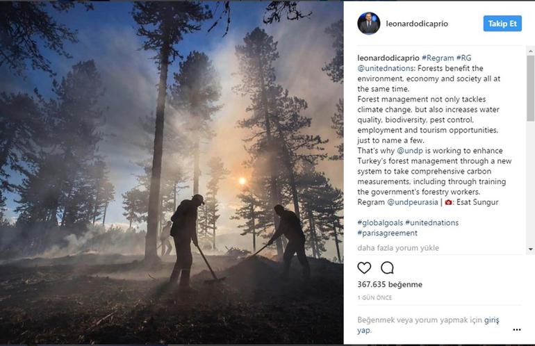 DiCaprio, yazısında "Bu nedenle, Birleşmiş Milletler Kalkınma Programı, devlete ait orman çalışanlarının eğitilmesi de dahil olmak üzere Türkiye 'nin orman yönetimini geliştirmek için çalışmaktadır" cümlesine yer verdi.