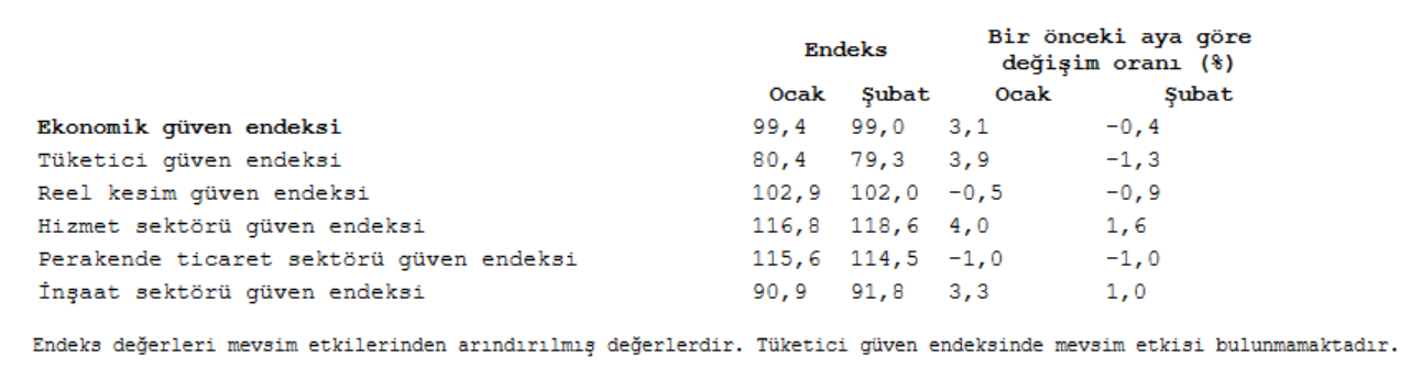 Bir önceki aya göre şubat ayında tüketici güven endeksi %1,3 oranında azalarak 79,3 değerini, reel kesim (imalat sanayi) güven endeksi %0,9 oranında azalarak 102,0 değerini, hizmet sektörü güven endeksi %1,6 oranında artarak 118,6 değerini, perakende ticaret sektörü güven endeksi %1,0 oranında azalarak 114,5 değerini, inşaat sektörü güven endeksi %1,0 oranında artarak 91,8 değerini aldı.