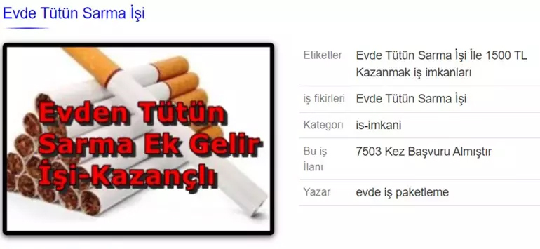 Evde tütün sarma işi ilanına başvuranlar, ilanı veren kötü niyetli kişilerin başlangıç ücreti olarak talep ettiği parayı gönderiyor ya da sardığı paket ücretinin ödenmemesiyle mağdur oluyor. Bazıları da banka aracılığıyla hesap numarasına gönderdiği az miktarda para sonrası görüşmelerde mağdurların kişisel bilgisini edinip, para aklama amacıyla kullanıyor.