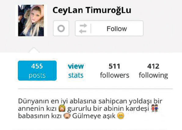 2’si kız 5 çocukları olan Timuroğlu Ailesi olayla ilgili konuşmazken, genç kızın öldürülmesi çalışma arkadaşlarını ve komşularını şoka uğrattı. Ceylan’ın arkadaşları, olaya inanamadıklarını söylerken, “Bir erkek arkadaşı olduğunu biliyorduk. Ağabeyinden de hep iyi bahsederdi” dedi. Sosyal medyada Ceylan’la ilgili başsağlığı mesajları yazılırken, genç kızın bir süre önce ailesiyle ilgili mesajı dikkat çekti. Ağabeyi ile ilgili genç kızın, “Dünyanın en iyi ablasına sahip, can yoldaşı bir annenin kızı, gururlu bir abinin kardeşi, babasının kızı, gülmeye âşık” diye yazdığı görüldü.