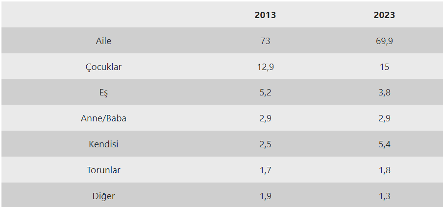 2013-2023 yılları itibarıyla mutluluk kaynağı olan kişi ve değerlerin oranı şöyle: