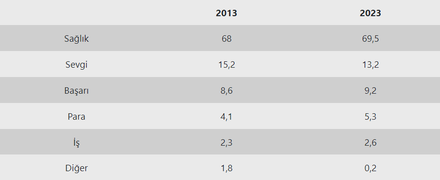 Son 10 yılda sağlık, başarı, para ve işi mutluluk kaynağı değerler arasında gösterenlerin oranı yükseldi. Mutluluğun sevgide olduğuna inanların oranında ise düşüş görüldü.