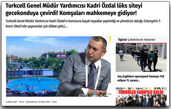 Bahçeşehir’deki Estonşehir 5 Sitesi’nde eşinin üzerine kayıtlı olan villasının ön ve arkasına, site ortak alanını kullanarak kaçak inşaatlarla ilaveler yaptığı için belediyeden ceza aldığı söylenen Turkcell Genel Müdür Yardımcısı Kadri Özdal’ın, bu durumdan şikayetçi olan komşularını sindirmek için çeşitli iddialarla Küçükçekmece Adliyesi’nde açtığı davaların hepsini kaybettiği belirtildi. Gelişmeler üzerine Özdal’ın Bahçeşehir’deki sitesini terk ederek Zekeriyaköy’de satın aldığı 3 katlı bir villaya taşınmak zorunda kaldığı kaydedildi.