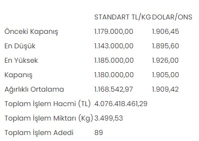 Altın piyasasında, en düşük 1 milyon 143 bin lira, en yüksek 1 milyon 185 bin lirayı gören standart altının kilogram fiyatı, günü önceki kapanışa göre yüzde 0,1 artışla 1 milyon 180 bin liradan tamamladı.
