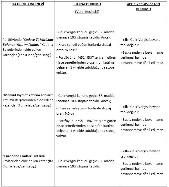 Yukarıdaki tabloda yer alan fonlardan; aşağıdaki özellik ve kıstaslara uygun olanlarda stopaj uygulaması aşağıdaki gibidir: