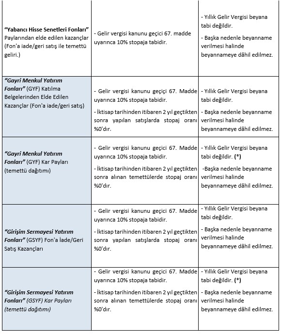Aşağıdaki tablodan görüleceği üzere şahıslar açısından yıllık gelir vergisi beyannamesi ile vergilendirme yoktur. Sadece gelirin tahsil edildiği anda stopaj (vergi kesintisi) usulüyle bir vergileme söz konusu olup, stopaj oranı da çoğu yerde %0’dır. Bu da yatırım fonu gelirlerinin ne kadar cazip olduğunu göstermektedir.