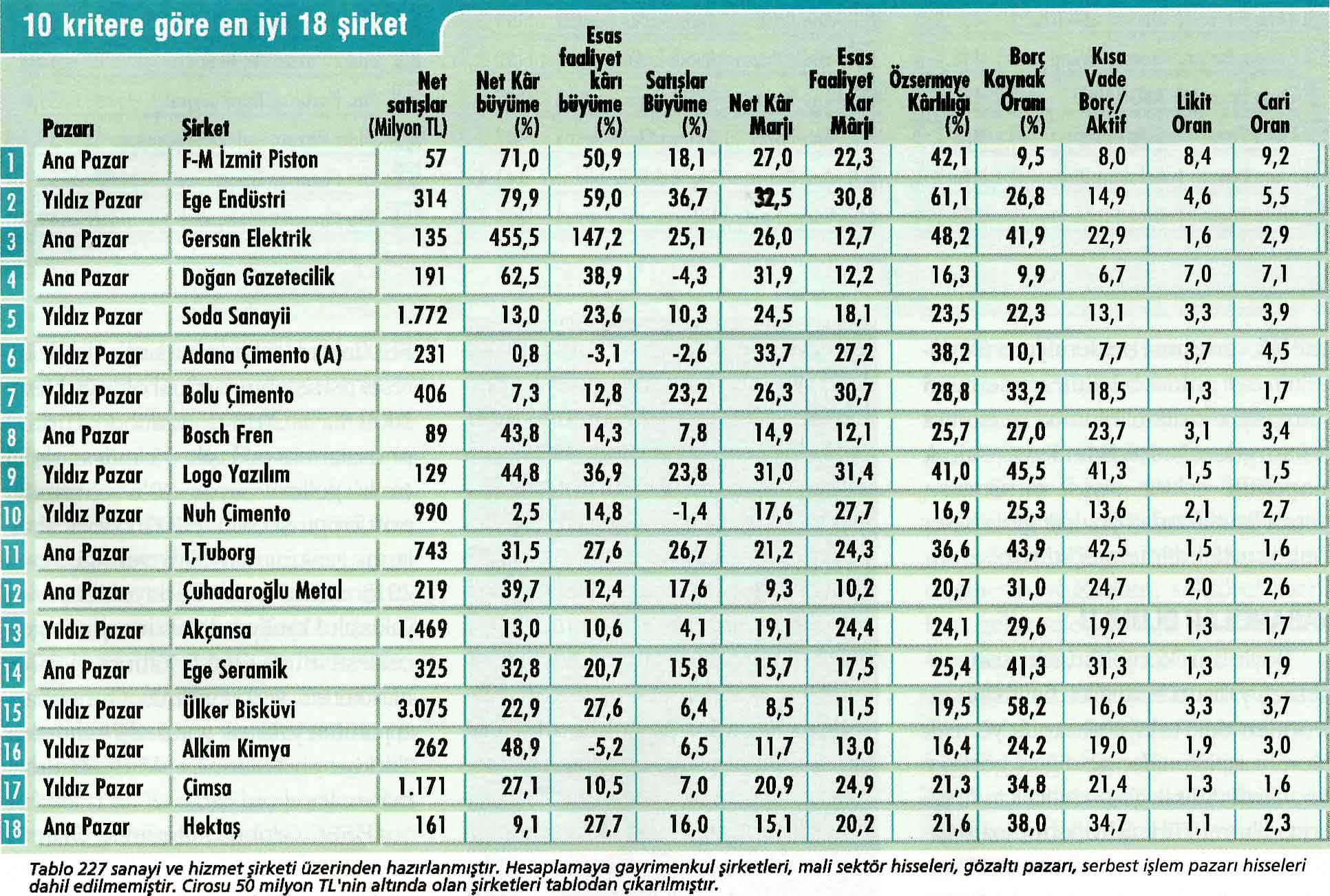 10 kriterin en güçlü hisselerini bulduk. Yine bu kriterlerde puanlama yapıp 10 kriteri konsolide ederek en iyi 18 bilançoyu analiz ettik. Burada sanayi ve hizmet bilançolarını inceledik. Yakın İzleme Pazarı, Piyasa Öncesi İletim Platformu, Gelişen İşletmeler Pazar şirketlerini, finans ve holding şirketlerini inceleme dışında tuttuk. Toplamda 227 şirket incelemeye alındı. 227 şirket üzerinden tabloları hazırladık. Bu tabloları son bir işlemden geçirerek 2015 bilançosunda 50 milyon TL cirosu olan şirketleri de liste dışı bırakarak, haberimizde gördüğünüz tabloları oluşturduk.