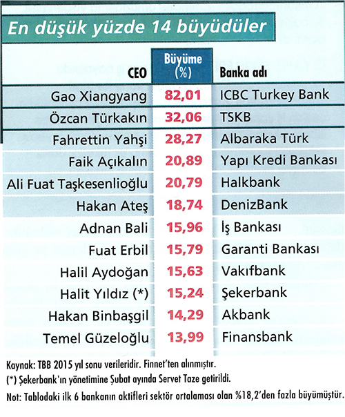 Kredilerde de aktif büyüklüğe pa¬ralel bir gelişme görülüyor. Yal¬nız burada sadece 5 CEO, sektörün üzerinde büyüme¬yi yakaladı. ICBC Turkey Bank, TSKB ve Yapı Kredi Bankası'nın yöneticileri bankalarının kredilerini en çok artıran isimler. ICBC Turkey Bank'ın kredilerde yakaladı¬ğı güçlü ivmeyi bankacılık danışmanı Tunç Akyurt, "Çinli veya Uzakdoğulu şirketlerin Türkiye'deki yatırımları ve kredi taleplerini bankaya kaydırmış olmaları yüksek ihtimal. Bu tarz ilk yıl büyümelerini, geçmişte Odeabank ve ABank'ta da gözlemlemiştik" diyor.