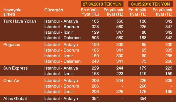 Gazete Habertürk'ten Eren Yılmazer'in haberine göre 27 Nisan Cuma günü tatile çıkan birinin Antalya’ya gitmek için ödeyeceği tek yön bilet fiyatı 560 TL’ye kadar yükseldi. Bodrum’a ve Dalaman’a en pahalı uçuş bileti 580 TL olurken, İzmir’e tek yön uçuş için ödenmesi gereken tutar 347 TL’yi buldu. Söz konusu güzergâhlara yapılacak uçuşlarda en ucuz biletlerin fiyatları yüzde 220’ye varan oranlarda zamlandı. En pahalı biletlerin fiyatlarındaki artışlar ise yüzde 70’lere ulaştı. 23 Nisan’ın pazartesi gününe denk gelmesiyle ortaya çıkan 3 günlük tatilde de en çok Ege Bölgesi ilgi görmüş, Balıkesir Edremit Kocaseyit Havalimanı’na uçuşlarda bilet fiyatları üçe katlanmıştı.
