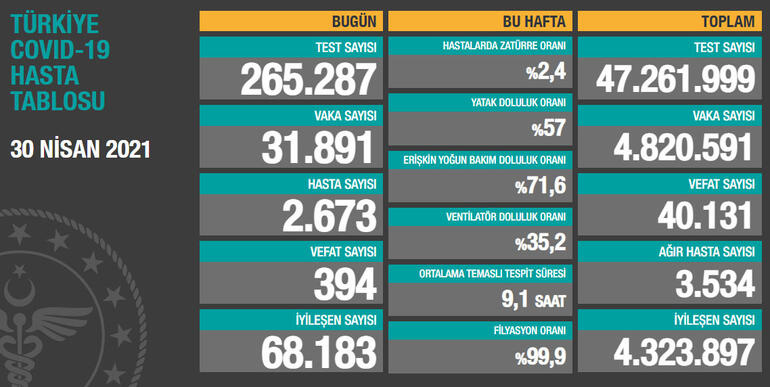 Sağlık Bakanlığı, 30 Nisan korona virüs tablosundaki test sayısını 265 bin 287 olarak açıklarken, 31 bin 891 vaka tespit edildiğini bildirmişti. Koronavirüsten 394 kişi hayatını kaybetmiş, taburcu olanların sayısı 68 bin 183 ve toplam iyileşen sayısını ise 4 milyon 323 bin 897 olarak açıklamıştı.