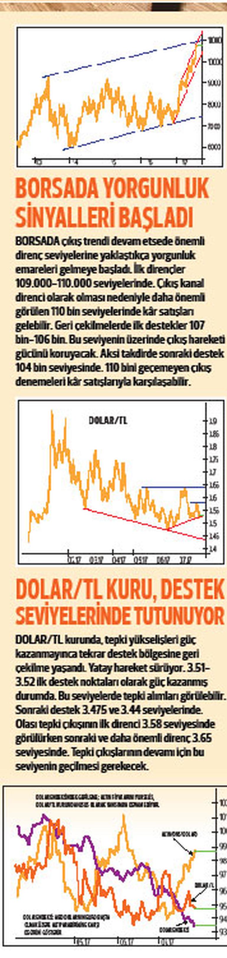 Borsada çıkış trendi devam etsede önemli direnç seviyelerine yaklaştıkça yorgunluk emareleri gelmeye başladı. İlk dirençler 109.000-110.000 seviyelerinde. Çıkış kanal direnci olarak olması nedeniyle daha önemli görülen 110 bin seviyelerinde kâr satışları gelebilir. Geri çekilmelerde ilk destekler 107 bin-106 bin. Bu seviyenin üzerinde çıkış hareketi gücünü koruyacak. Aksi takdirde sonraki destek 104 bin seviyesinde. 110 bini geçemeyen çıkış denemeleri kâr satışlarıyla karşılaşabilir.