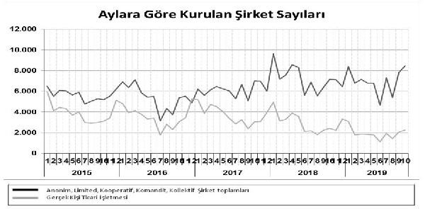 TOBB verilerine göre, ilk 10 ayda 69 bin 478 şirket ve kooperatif kuruldu. Bu dönemde kurulan toplam 59 bin 321 limited şirket, toplam sermayenin yüzde 68.36’sını, 9 bin 187 anonim şirket ise yüzde 31.62’sini oluşturdu. Ekim ayında kurulan şirketlerin sermayelerinin toplamı, Eylül ayına göre yüzde 15.87 arttı.