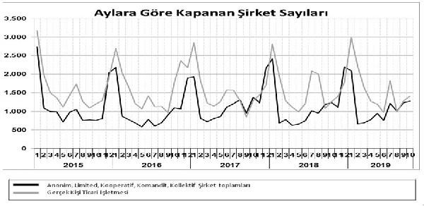 Yılın ilk 10 ayında 2018 yılının aynı dönemine göre kapanan şirket sayısı yüzde 5.52 artarken, kapanan gerçek kişi ticari işletme sayısı yüzde 0.32 kapanan kooperatif sayısı yüzde 15.94 azaldı.
