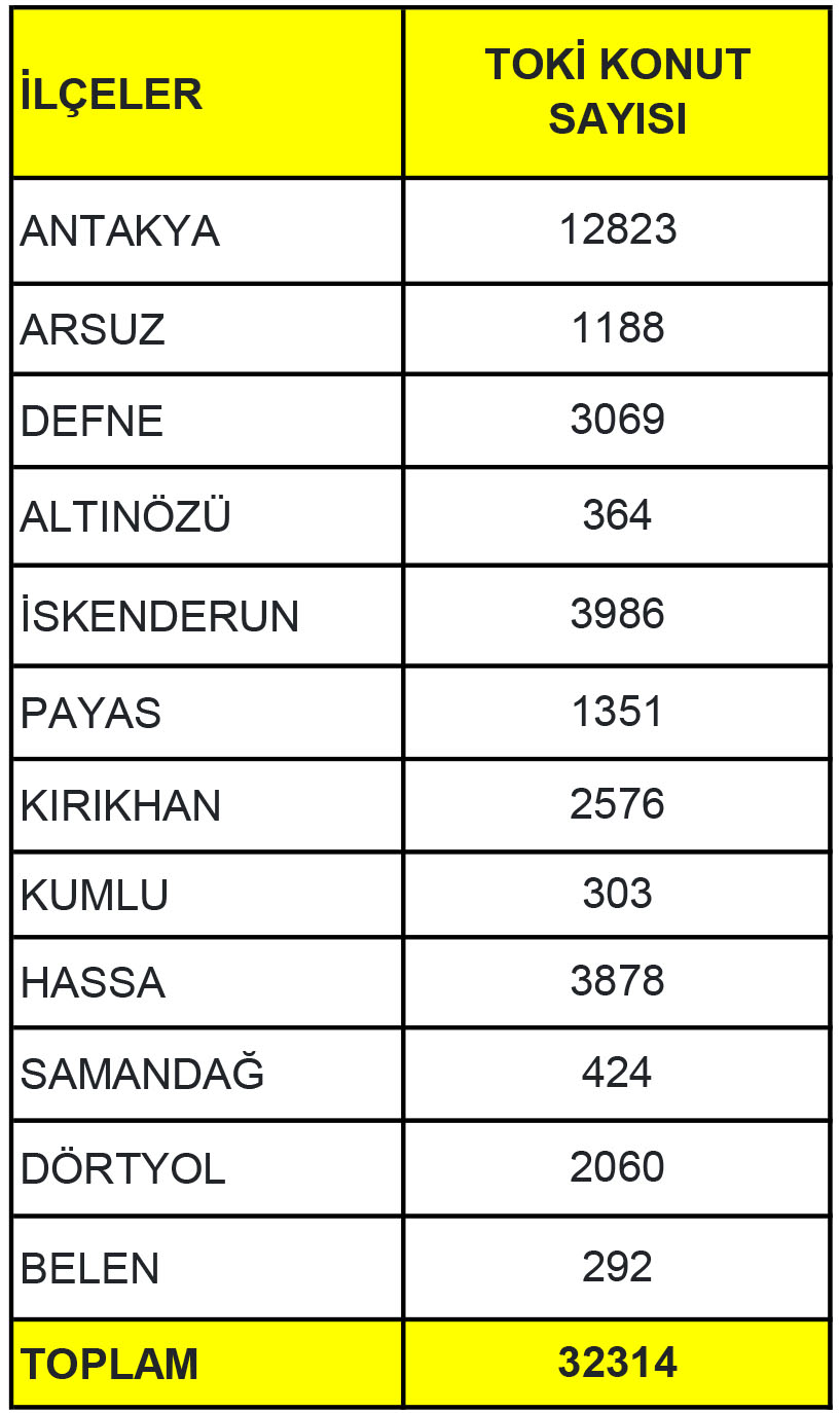 Hatay'ın ilçelerine göre yapımı süren TOKİ'nin kalıcı konut sayıları şöyle: