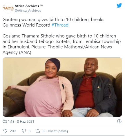 Gosiame Thamara Sithole isimli 37 yaşındaki kadın, 7 erkek 3 kız olmak üzere 10 çocuk dünyaya getirdi.