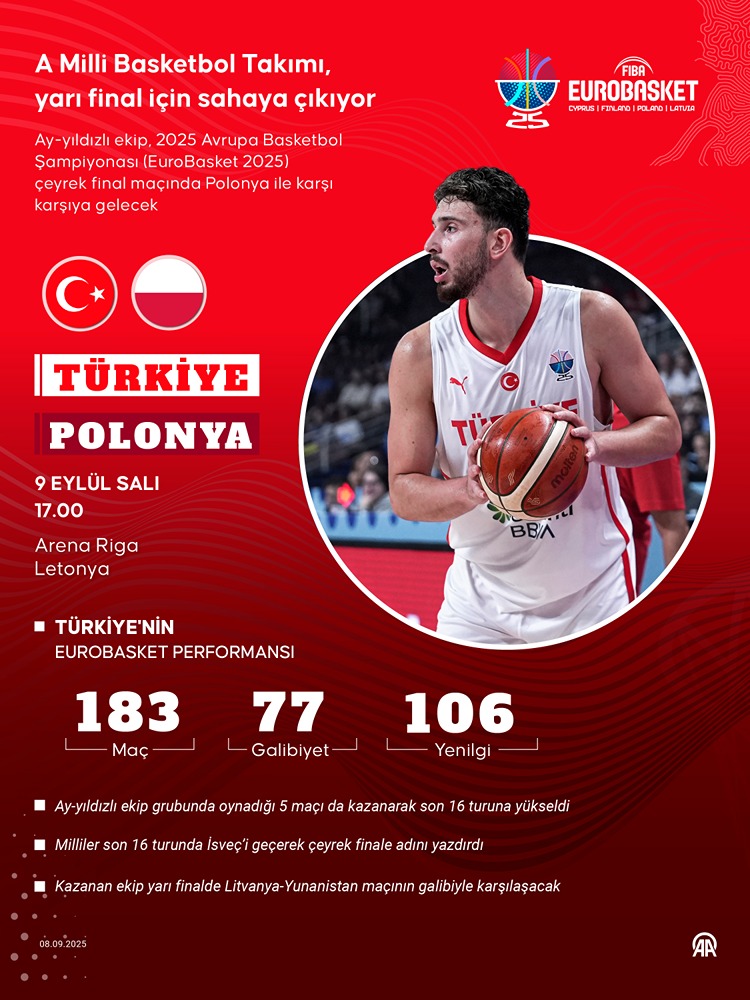 A Milli Erkek Basketbol Takımı, 2025 Avrupa Basketbol Şampiyonası (EuroBasket 2025) çeyrek final maçında bugün Polonya ile karşı karşıya gelecek.