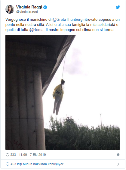 İtalya'nın başkenti Roma'daki bir köprüden 16 yaşındaki İsveçli aktivist Greta Thunberg'in temsili bir kuklası sarkıtıldı. Savcık konuyla ilgili soruşturma başlattı.