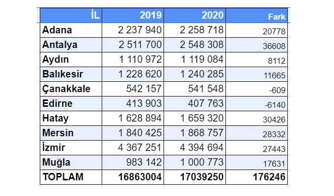 Edirne, Çanakkale, Balıkesir, İzmir, Aydın, Muğla, Antalya, Mersin, Adana ve Hatay'ın 2019 yılındaki toplam nüfusu 16 milyon 863 bin 4'ten, 17 milyon 39 bin 250'ye çıktı.