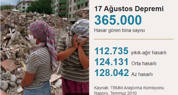Resmi rakamlara göre, depremde 18 bin 373 kişi hayatını kaybetti, 48 bin 901 kişi de yaralandı. 5 bin 840 kişi de kayboldu.
