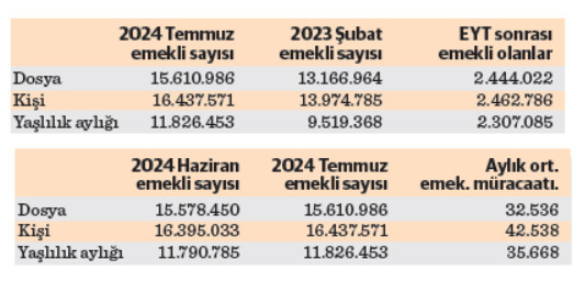 2024 Haziran emekli sayısı 2024 Temmuz emekli sayısı Aylık ort. emek. müracaatı. EYT ile emeklilik hakkı elde etmiş yaklaşık 4 milyon 500 bin kişiden 2 milyon 307 bini emekli oldu. EYT ile yaş şartı olmadan emeklilik hakkı elde edip prim gün sayısı eksik olan yaklaşık 2 milyon 193 bin prim gün sayısını tamamladıklarında emekli olacaklar. Son SGK istatistiklerine göre aylık bazda 35.668 kişi emekli olmuş.