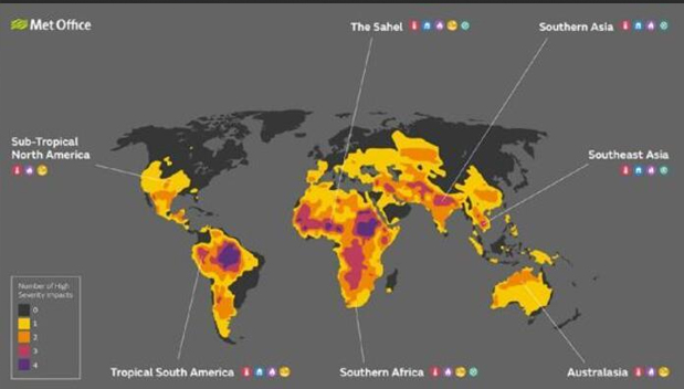 Kurumdan yapılan açıklamada, bu riskin can kayıplarını da içerebileceği vurgulandı. MET Office’te yayınlanan haritada, söz konusu senaryoda Afrika kıtasının merkezi, Güney Amerika, Avustralya’nın kuzeyi ve Tayland, Vietnam, Malezya gibi ülkelerin de risk altına gireceği öngörülüyor.