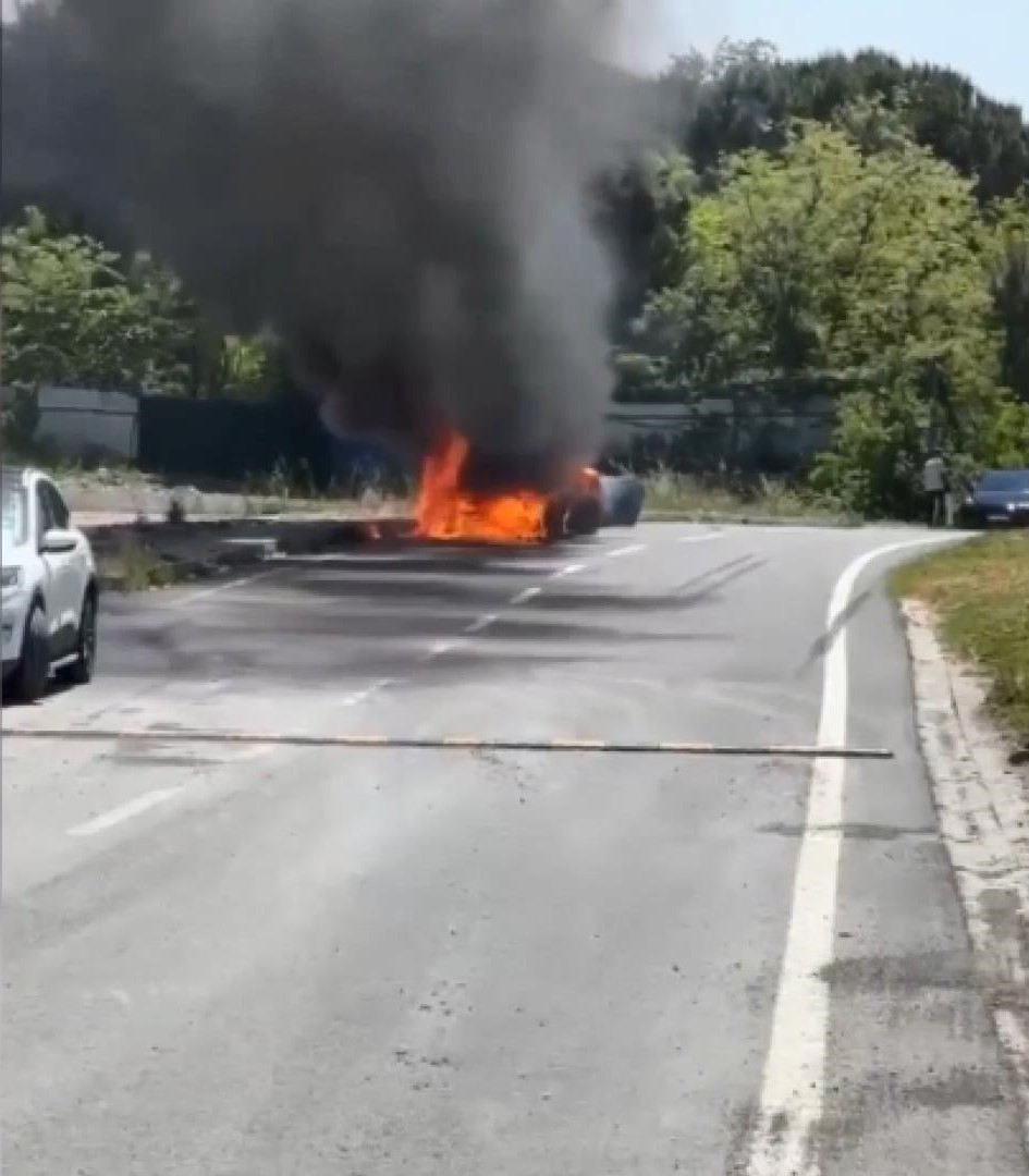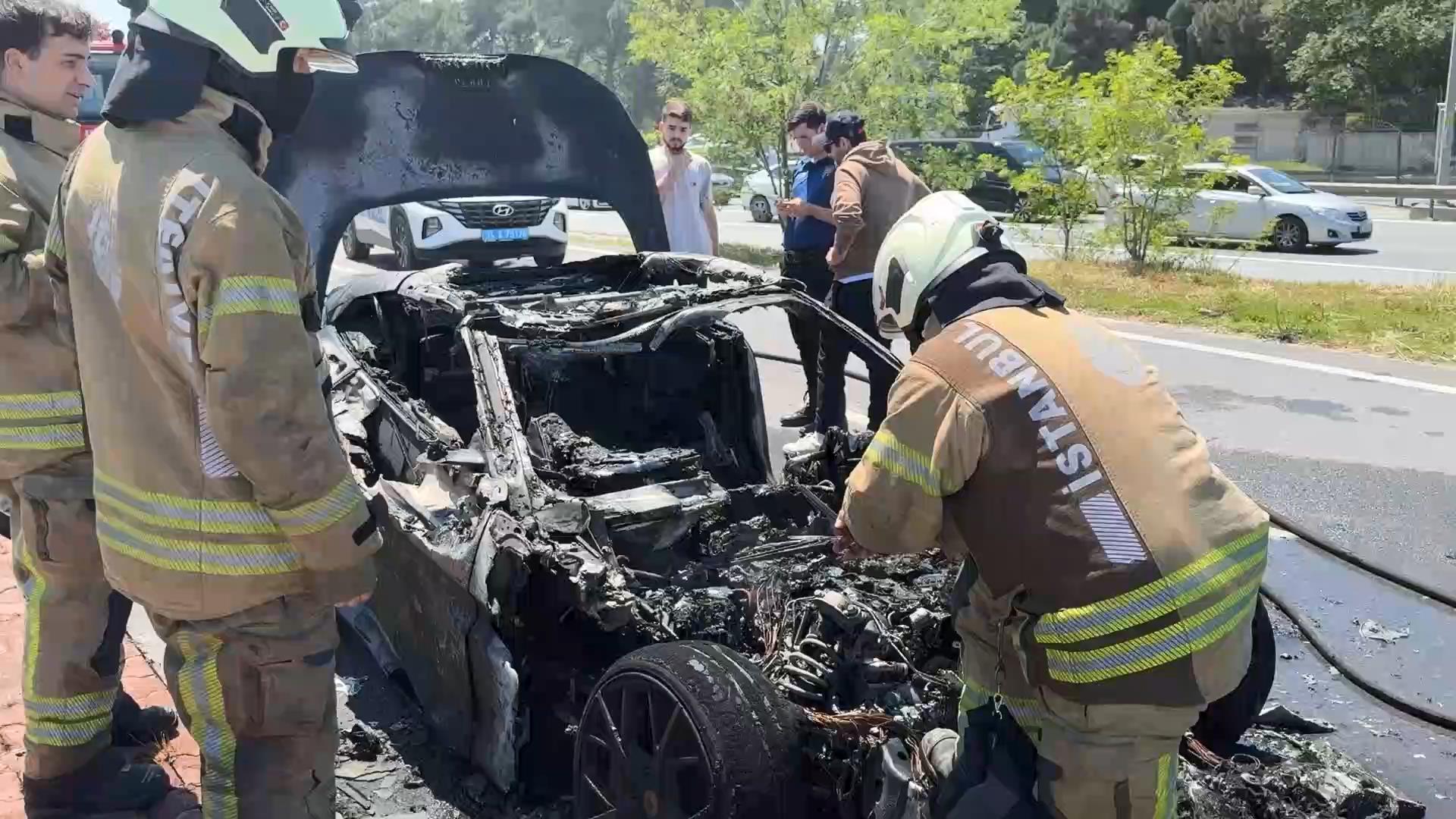 Dumanları fark eden sürücü, aracıyla yol kenarında durdu. Aşağı inen sürücü, yangın tüpüyle alevlere müdahale etti. O sırada araçta ufak çaplı patlama meydana geldi. Lüks otomobil kısa sürede demir yığınına döndü.