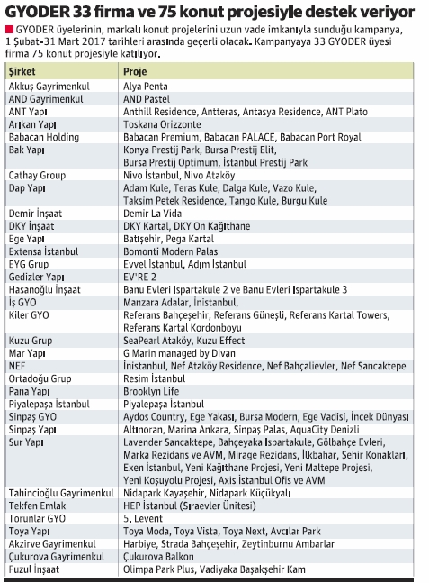 Emlak Konut GYO öncülüğünde ve Konut Geliştiricileri ve Yatırımcıları Derneği (KONUTDER) ile Gayrimenkul Yatırım Ortaklığı Derneği’nin de (GYODER) desteğiyle gerçekleşen yeni 20 yıl vadeli konut seferberliğine Emlak Konut GYO’nun projeleri dışında kalan firmalardan da destek geldi. Özel sektör firmaları da binlerce adet konutlarıyla kampanyaya dahil oldu. “Güçlü Türkiye İçin Birlik Vakti” söylemiyle ülke genelinde birçok firma ve projeyi kapsayan kampanya 1 Şubat itibariyle başladı. Kampanyada yüzde 5 peşinat ile 10 yıl için 0.45 vade ve 20 yıl için 0.79 vade ile ev sahibi olmak mümkün.