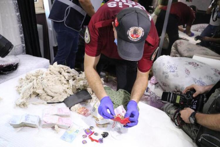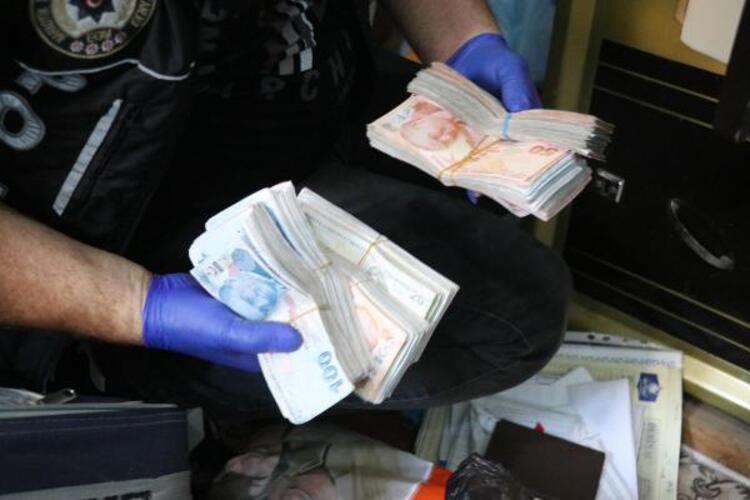 Evde yapılan aramalarda, çelik kasadaki torbalar içerisinde 200 bin TL, yastık içerisine gizlenmiş 70 bin TL ile çok sayıda altın ve bileziğe el konuldu.