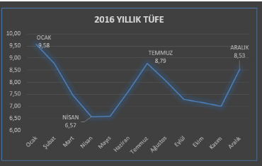 TÜİK verilerine göre; TÜFE'de (2003=100) 2016 yılı aralık ayında bir önceki aya göre yüzde 1,64, bir önceki yılın Aralık ayına göre yüzde 8,53, bir önceki yılın aynı ayına göre yüzde 8,53 ve on iki aylık ortalamalara göre yüzde 7,78 artış gerçekleşti.