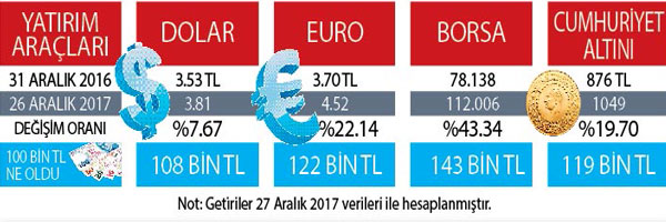Ancak düşen seyrini koruması küresel piyasalarda yükselişi getirdi. ABD borsalarında rekor üstüne rekorlar kırılırken gelişmekte olan ülkelere fon akış devam etti. BIST 100 Endeksi yılı yüzde 43 getiriyle tamamladı. Euro yüzde 22, Cumhuriyet altını yüzde 19.40 oranında değer kazandı.