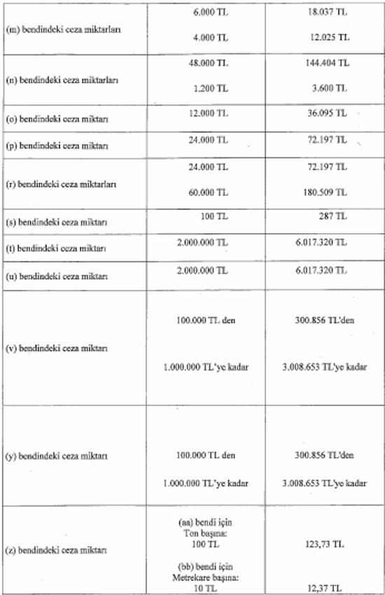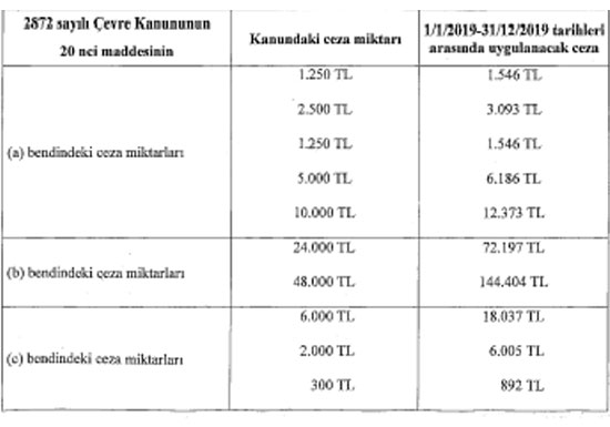 Bu duruma binaen, 2872 sayılı Kanunun 20 nci maddesinde yer alan para cezaları 1/1/2019 tarihinden itibaren aşağıda belirtilen miktarlarda uygulanacaktır.