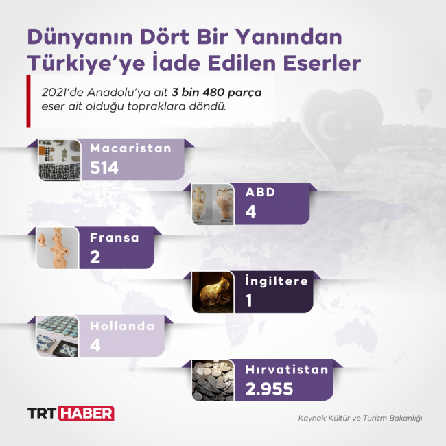 Kültür ve Turizm Bakanlığı’na bağlı Kültür Varlıkları ve Müzeler Genel Müdürlüğü Kaçakçılıkla Mücadele Daire Başkanlığı ekiplerinin titizlikle sürdürdüğü çalışmalar sonucunda 2021’de 3 bin 480 eser Türkiye’ye getirildi.