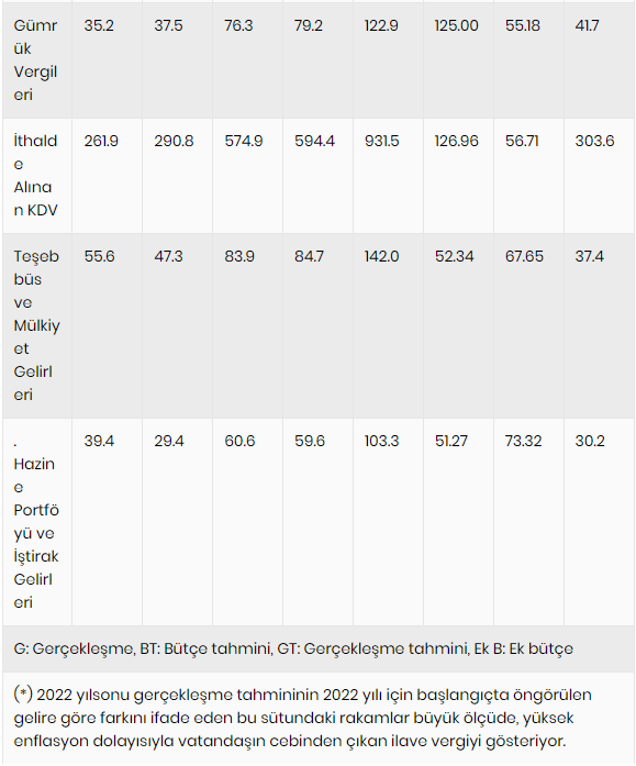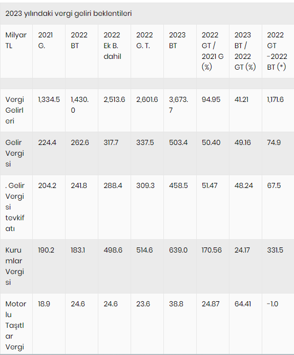 Bütçe teklifine göre, 2022 yılında yüzde 50.4 oranında artan gelir vergisi gelecek yıl yüzde 49.2 oranında artarak 503.4 milyar lira olacak. İşçi ve memur gibi ücretlilerden alınan gelir vergisini de kapsayan gelir vergisi tevkifatı yüzde 48.2 artışla 458.5 milyar liraya çıkacak. Yılın başında 241.8 milyar lira olarak öngörülen gelir vergisi tevkifatının yılsonunda 309.3 milyar liraya ulaşması bekleniyor.