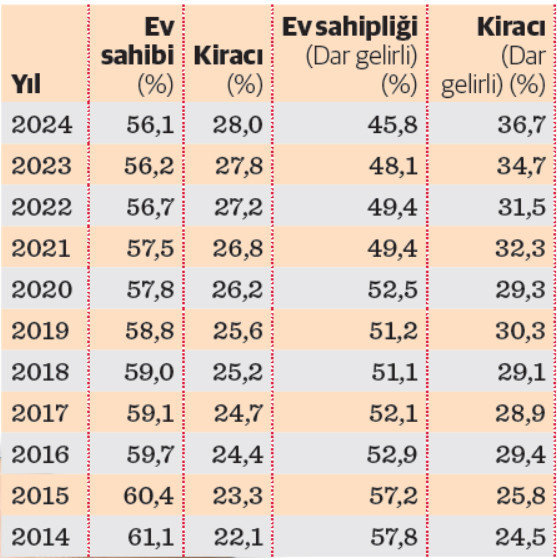 Türkiye İstatistik Kurumu (TÜİK) verilerine göre, son 10 yılda ev sahipliği oranı yüzde 61,1’den yüzde 56,1’e gerilerken, kiracı oranı yüzde 22,1’den yüzde 28’e yükseldi. Dar gelirli vatandaşlar arasında bu düşüş daha çarpıcı. Ev sahipliği oranı yüzde 57,8’den yüzde 45,8’e düşerken, kiracı oranı yüzde 24,5’ten yüzde 36,7’ye çıktı. Bu veriler, yaklaşık 23,9 milyon kişinin kirada yaşadığını gösteriyor.