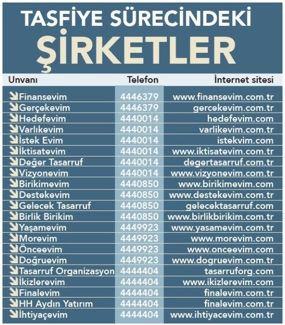 Henüz teslimat almamış tasarruf birikimi ödemesi yapan müşterilerin, sözleşmeden kaynaklanan taksit ödemeleri durdurularak, bu kişiler daha sonra yapılacak duyurular ile alacaklarını tasfiye komisyonuna bildirmeye çağrılacak.