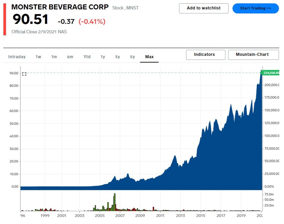 1997 yılında Hansen's Natural olarak borsaya kote olan enerji içeceği şirketi, geçtiğimiz 24 yılda Jeff Bezos’un Amazon’unu geçen tek şirket oldu. Amazon yüzde 170 bin arttığı süreçte 2012 yılı itibarıyla Monster Beverage adıyla faaliyetlerine devam eden enerji içeceği şirketi ise Amazon’u neredeyse ikiye katlayarak yüzde 322 bin arttı.