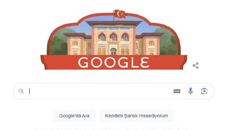 Doodle görselinde, Ankara'daki 1. Meclis binası ve Türk bayrağı bulunuyor.