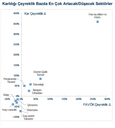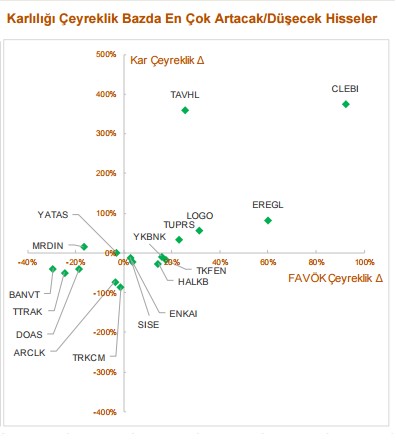Takip listemizdeki finans dışı şirketlere baktığımızda ise tahminlerimize göre birkaç istisna hariç çoğu sektörde 3Ç16 FAVÖK artışı enflasyonun altında kalıyor. Öte yandan 3Ç16’da TL’de dolara karşı değer kaybının (%4) 3Ç15’in (%13) altında gerçekleşmesi döviz borcu olan şirketlerin net kar büyümelerini destekliyor. Düşük hammadde fiyatları ve yükselen çelik fiyatları arasındaki makastan faydalanan ve ürünlerini dolar bazında fiyatlayan çelik sektörü yıllık FAVÖK ve net kar artışında üst sırada yer alıyor. Turizm sektöründeki daralmanın olumsuz etkilediği havacılık sektörü 3Ç’de de karlılığı yıllık bazda en fazla daralan sektör. Hisse bazında baktığımızda ise Erdemir, Anadolu Cam, Tekfen Holding ve Pınar Süt, yıllık FAVÖK ve net kar artışında öne çıkan isimler. Celebi, Pegasus, Dogus Oto, ve Tupras ise FAVÖK rakamı yıllık bazda en fazla daralan şirketler arasında.