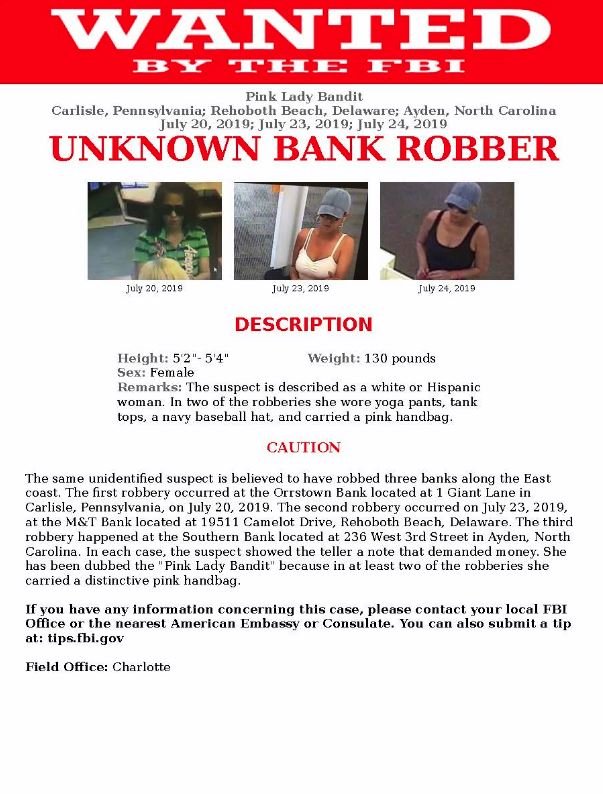 Federal Soruşturma Bürosu, doğu yakasında üç eyalette dört bankayı soyduğu söylenen “Pink Lady Bandit” olarak bilinen bir seri banka soyguncusunun hakkında hiçbir bilgiye ulaşamayınca 10 bin dolar (yaklaşık 58.000 TL) para ödülünü sosyal medyada paylaştı.