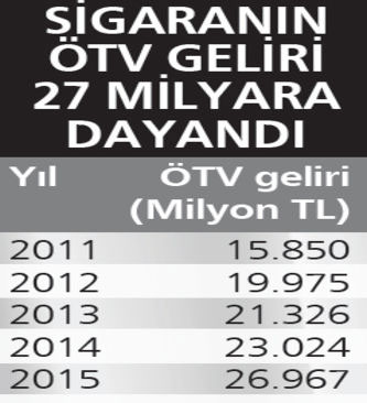 Sigara pazarının büyümesi devletin vergi gelirlerine de olumlu yansıyor. Örnek bir hesaplamadan hareket etmek gerekirse, 8 TL’lik bir sigara paketinin 6.69 TL’si vergiye gidiyor. Bu olumlu etkiyi ÖTV gelirleri rakamlarında da görmek mümkün. Sigaradan elde edilen ÖTV gelirleri 2015 yılında 27 milyar TL’ye yaklaşırken, son 10 yılın rakamlarına bakıldığında da sigaradan elde edilen ÖTV gelirlerinin, o yılın başında bütçede öngörülen rakamın hemen hemen hep üzerinde bir rakam elde edildiği göze çarpıyor.