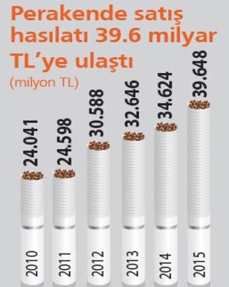 Türkiye’de sigara pazarı artan vergileri takiben yapılan zamlar ve kapalı alanlarda tüketime getirilen yasaklarla birlikte 2008 yılından itibaren belli bir düşüş trendine geçmişti. Bu süreçte kaçak sigara oranı artış göstermiş, kayıt içi sigara pazarı ise 91 milyar adetlere kadar düşmüştü. Ancak 2015 yılının Tütün ve Alkol Piyasası Düzenleme Kurumu (TAPDK) rakamlarına göre kayıt içi sigara pazarı 2009’dan sonra ilk defa 100 milyar adet bandını geçerek 103.2 milyar adet olarak gerçekleşti. Bu önceki yıla göre yüzde 9’luk artış anlamına geliyor.