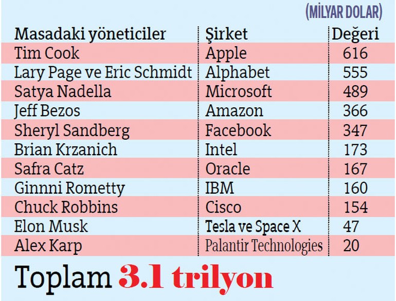 Trump’un davetiyle New York’taki Trump Tower’daki toplantıya katılan 13 firmanın toplam büyüklüğü 3 trilyon doları geçiyor. İlk defa bir masa etrafında bir araya gelen ABD’nin teknoloji devleri ekonomik büyüklükleriyle dünyanın beşinci büyük ekonomisini oluşturuyorlar. Büyüklükleriyle Türkiye’nin bütçesini de 4’e katlayan masadaki konuklar, İngiltere, Fransa ve hatta Hindistan gibi ülkeleri bile geride bırakıyorlar. Trump Tower’ın 25’inci katındaki ofiste gerçekleştirilen toplantıya ABD Başkan Yardımcısı seçilen Mike Pence’in yanı sıra ekibine kattığı Steve Bannon, Reince Priebus Wilbur Ross, Gary Cohn gibi isimler katılırken çocukları Ivanka Trump, Eric Trump ve Donald Jr. Trump masanın bir ucunda yer aldı. Beyaz Saray’da Trump ile çalışması kesinleşen damadı Jared Kushner ise Ivanka’da ayrı olarak Trump’ın karşısında oturdu.
