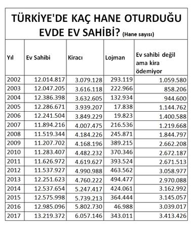 Türkiye İstatistik Kurumu’nun (TÜİK) Hanehalkı Tüketim Harcamaları 2017 verilerine göre Türkiye’de bulunan 23 milyon hanenin 13.2 milyonu kendi sahip olduğu evde oturuyor. 6 milyon hane ise yaşadığı konut için kira ödüyor. Rakamlara oransal olarak bakılırsa ise şu tablo ile karşılaşılıyor:(Erdem Aktürk/Habertürk)