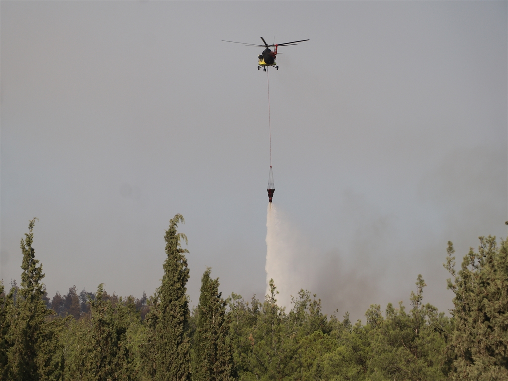 Rüzgar ve arazi şartları ekiplerin çalışmasını güçleştirirken, yangının ilerlemesini önlemek ve önünü kesmek için iş makineleriyle ormanlık alana yol açıldı.