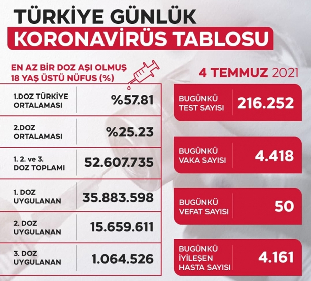 Türkiye'de son 24 saatte 216 bin 252 Kovid-19 testi yapıldı, 4 bin 418 kişinin testi pozitif çıktı, 50 kişi hayatını kaybetti.