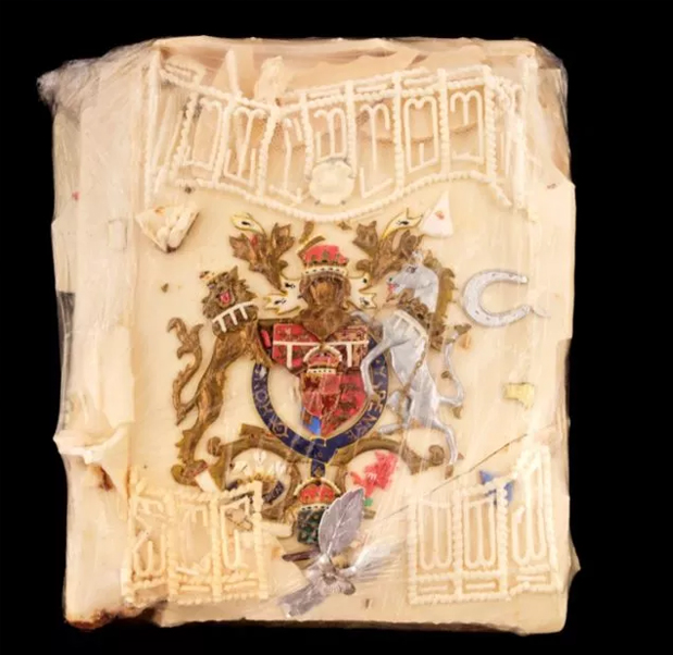Moyra tarafından bir kek kalıbında streç film içinde muhafaza edilen pasta, gelecek ay müzayedeci Dominic Winter’ın İngiltere’deki müzayedesinde satılacak.