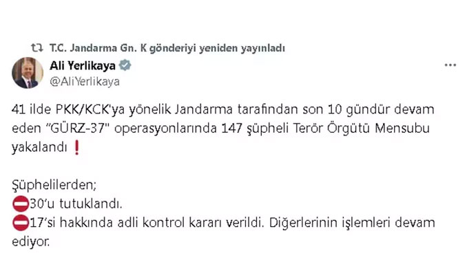 İçişleri Bakanı Ali Yerlikaya, sosyal medya hesabından yaptığı açıklamada, Cumhuriyet başsavcılıkları ile Jandarma Genel Komutanlığı Terörle Mücadele Daire Başkanlığı koordinesinde; 41 ilde PKK/KCK'ya yönelik son 10 gündür devam eden 'Gürz-37' operasyonlarında 147 şüpheli terör örgütü mensubunun yakalandığını, 30'unun tutuklandığını belirtti.