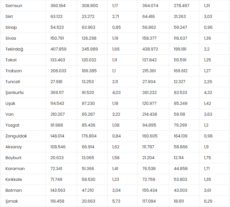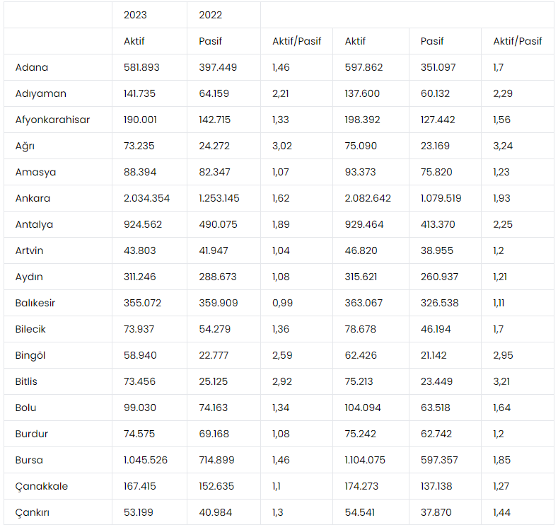 Bir emekli başına düşen aktif sigortalı sayısını gösteren aktif / pasif oranı 2022 yılına göre 2023 yılında Zonguldak’ta 0,98’den 0,84’e, Sinop’ta 0,96’dan 0,85’e, Balıkesir’de 1,11’den 0,99’a, Giresun’da 1,06’dan 0,93’e, Bartın’da ise 1,05’ten 0,93’e geriledi. Başka bir ifadeyle 2022 yılında Zonguldak’ta 100 emekliye 98 aktif sigortalı düşerken, 2023 yılında 84 emekli düştü.